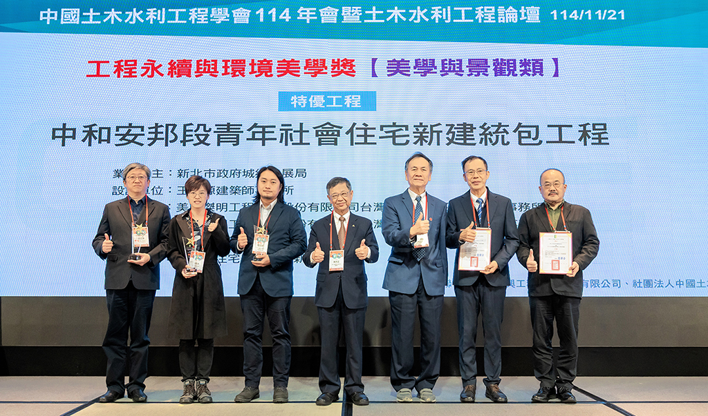 在眾多參賽作品中,本公司負責施工的「中和安邦段青年社會住宅新建統包工程」以兼具環境融合、公共美學與社區共融的優秀表現獲得評審青睞,榮登本年度美學類「特優」肯定。