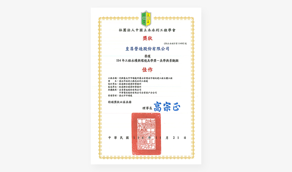 皇昌營造承攬的「代辦臺北市市場處所屬公有環南市場改建工程主體工程」榮獲美學與景觀類「佳作獎」,為本公司在公共建設領域再添一筆重要成就。