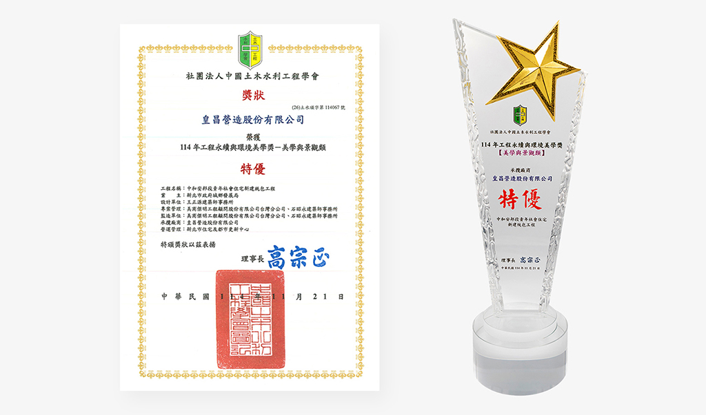 皇昌營造能於本屆工程永續與環境美學獎中,獲得「特優」與「佳作」雙獎,象徵本公司在永續建築推動、工程品質管理、公共空間美學提升、景觀整合與友善環境打造等領域的努力獲得專業肯定。